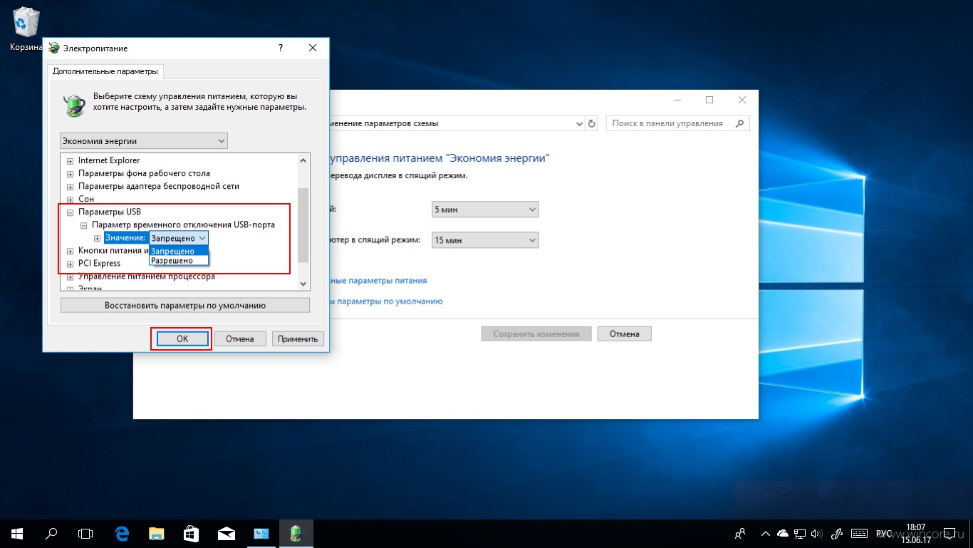 4. Снимите флажок В спящем режиме отключать подачу питания на USB-порты.