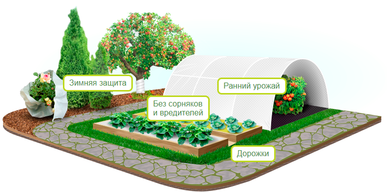 АГРОТЕКС — нетканое полотно— пропускает воздух, воду и нужный спектр света, защищает растения от непогоды, сорняков, насекомых, болезней, позволяет мульчировать почву. Кроме того, нетканый материал применяется в разделении грунта при ландшафтных работах. Полотно способно защитить растения от низких температур (до -9ºС).