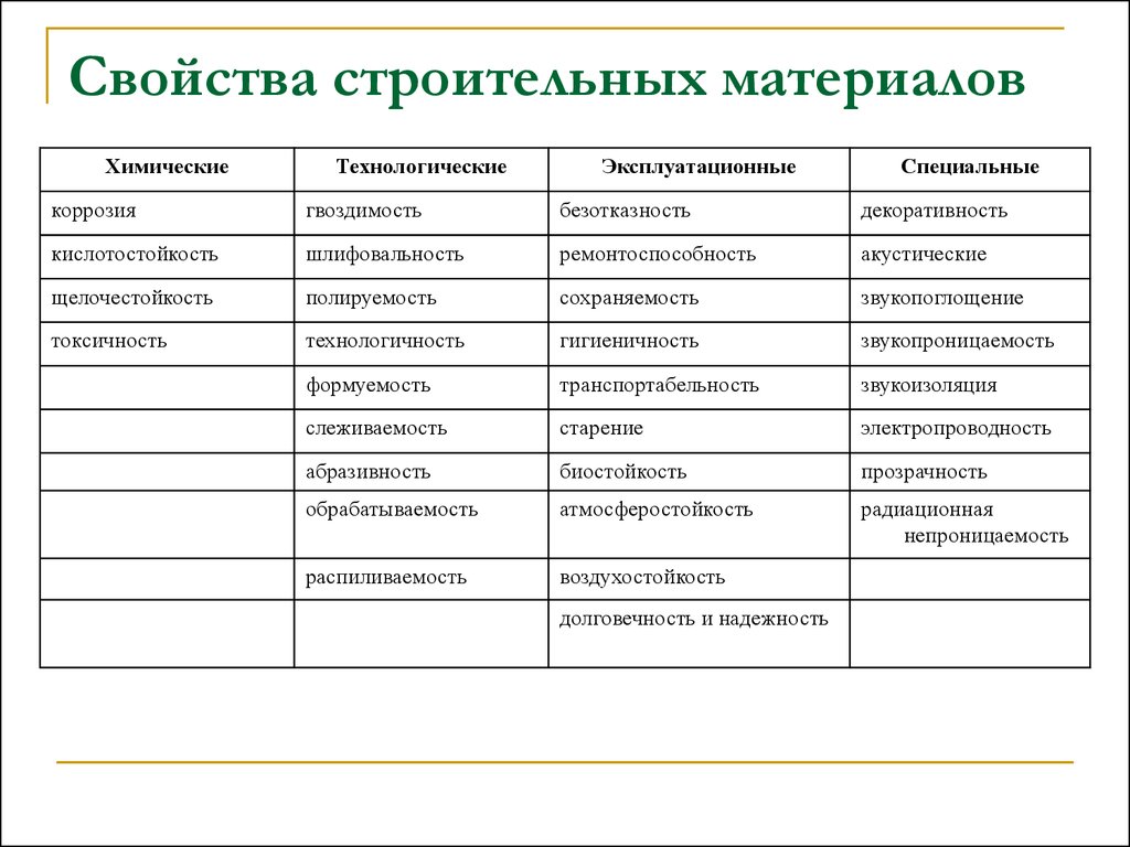 https://fb.ru/article/403660/osnovnyie-svoystva-stroitelnyih-materialov-mehanicheskie-fizicheskie-himicheskie-i-tehnologicheskie-klassifikatsiya-stroymaterialov-i-novinki-v-sovremennom-stroitelstve