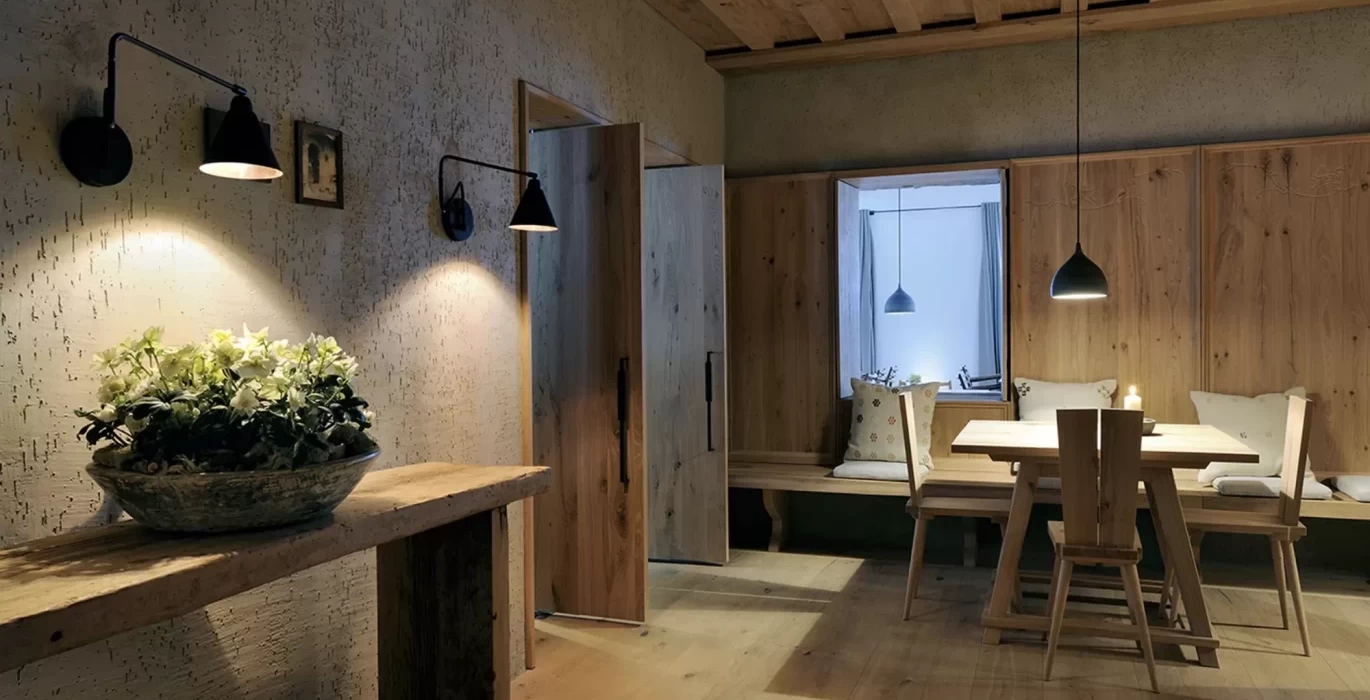 Грубая по фактуре штукатурка, применяемая в помещении, способна придать оформлению необычные эффекты и брутальность. Эффект будет ярче и выразительнее в сочетании со светильниками под старину.